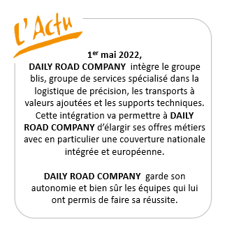 Créée en 2007, DAILY ROAD COMPANY offre une très large gamme de services grâce à sa flotte de véhicules de la moto au poids lourd..